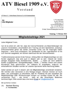 Daher werden wir auch in diesem Jahr die Mitgliedsbeiträge unverändert einziehen. Wir möchten aber niemanden in eine Notlage bringen. Deshalb möchten wir Euch bitten, uns unverzüglich zu informieren, falls Ihr Probleme mit dem Einziehen der Mitgliedsbeiträge habt. Rückbuchungen bringen nur unnötige Kosten für alle. Wir versprechen Euch – wie immer – dass wir alle berechtigten Bedenken berücksichtigen. Bitte sendet dazu eine kurze Email an info@atvbiesel.de.