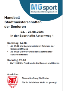 Handball Stadtmeisterschaften der Senioren ATVBiesel 8. August 2024 Allgemein Plakat SMS2024 teilen teilen teilen teilen merken teilen teilen teilen teilen Beitragsnavigation Zurück Vorheriger Beitrag: Ostercamp ATV Biesel 2024Weiter Nächster Beitrag: ATV Weihnachtsfeier 2024